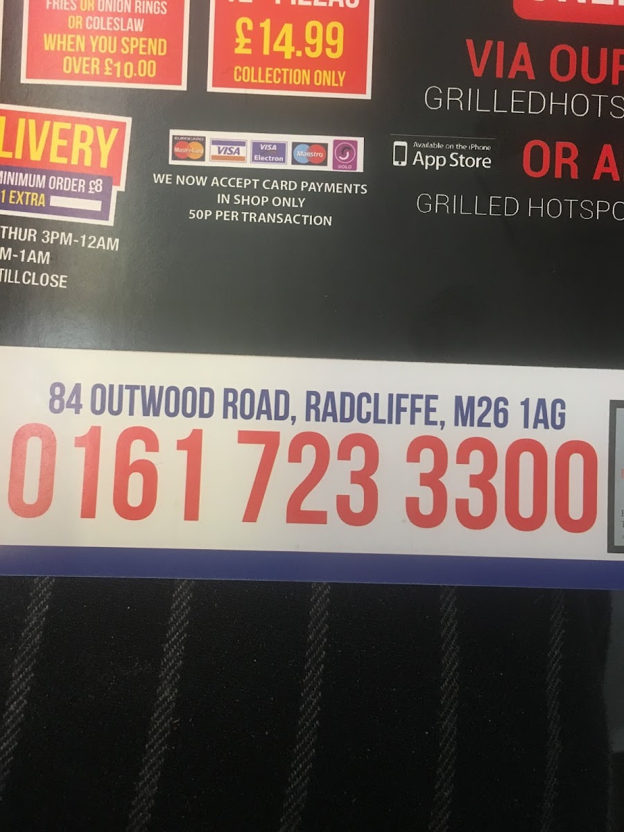 The menu at Grilled Hotspot in Radcliffe offers a wide variety of delicious options, ensuring there's something for everyone. Pizzas come in various sizes, with the 9" Margherita Pizza, 12" Margherita Pizza, and 14" Margherita Pizza providing a tasty base for all pizza lovers. For those who prefer a bit more flavor, the 9" Pepperoni Pizza and 12" Pepperoni Pizza are also available. If you're looking for a snack, the garlic bread options include 9" Garlic Bread, 12" Garlic Bread, and 14" Garlic Bread, with cheese options also on offer. The burger meals range from the classic Beef Burger and Cheese Burger to the more adventurous Hot Spot Special Burger and Supreme Chicken Burger. For kebab enthusiasts, the Donner Kebab, Shish Kebab, and Hotspot Special Kebab are top picks. Wraps, including the Chicken Wrap and Hotspot Special Wrap, add a convenient and tasty choice for a quick bite. Fried chicken fans will appreciate options like 1Pc Fried Chicken or a more filling 4Pcs Fried Chicken. The Spicy Wings and Peri Peri Wings are perfect for those who enjoy bold flavors, while Peri Strips offer a different take on the classic. For something special, the Half Chicken Platter and Full Chicken Platter are great choices. The sides include Reg Fries, Lrg Fries, and Peri Fries, with a selection of dips like Chilli Dip and Garlic Dip. Kids can enjoy their own meals with options like the Kids 5Pcs Chicken Nuggets Meal. Additionally, there are meal deals, including the Kebab Meal Deal and Family Pizza Meal, making dining even more convenient. For dessert, treat yourself to Lotus Vanilla Cheesecake or Chocolate Fudge Cake, and wash it down with a variety of soft drinks. Grilled Hotspot’s menu is designed to satisfy all appetites, offering something for every craving.